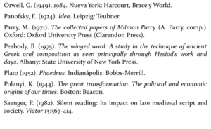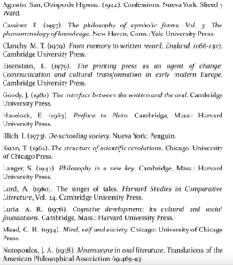 Con estas sugerencias, espero haber dejado en claro el tema y la necesidad de la investigación que propongo. Esta investigación se basa en una fenomenología histórica de supuestos sobre el habla. Sólo la técnica del alfabeto nos permite registrar el habla y concebir este registro»en el alfabeto» como «lenguaje» que usamos al hablar. Este supuesto determina cierto modo específico de concebir el pasado y de formar a los jóvenes. La investigación que propongo estaría dirigida a identificar los supuestos que son característicos y distintivos de la «educación» sólo dentro de este espacio mental.
